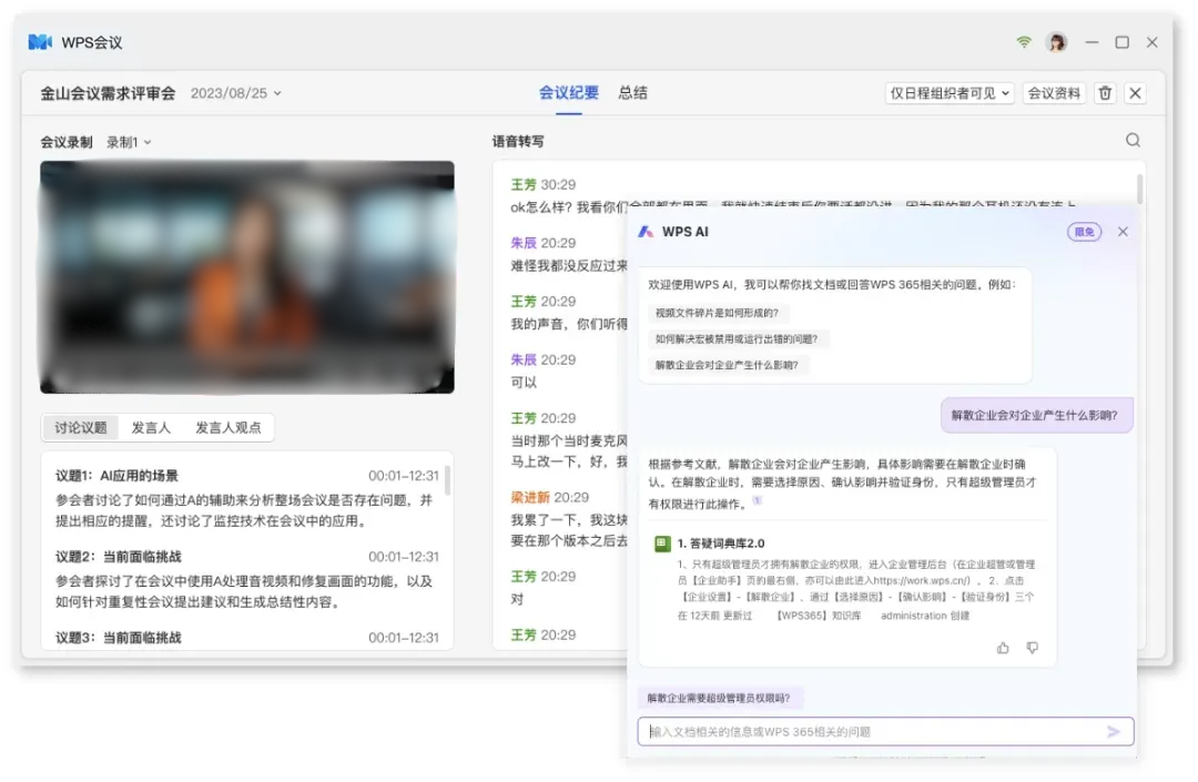 多端接入:WPS客户端、WPS协作客户端,能自动整理会议记录,总结会议要点,沟通协作更顺畅。随时随地“云上头脑风暴”!