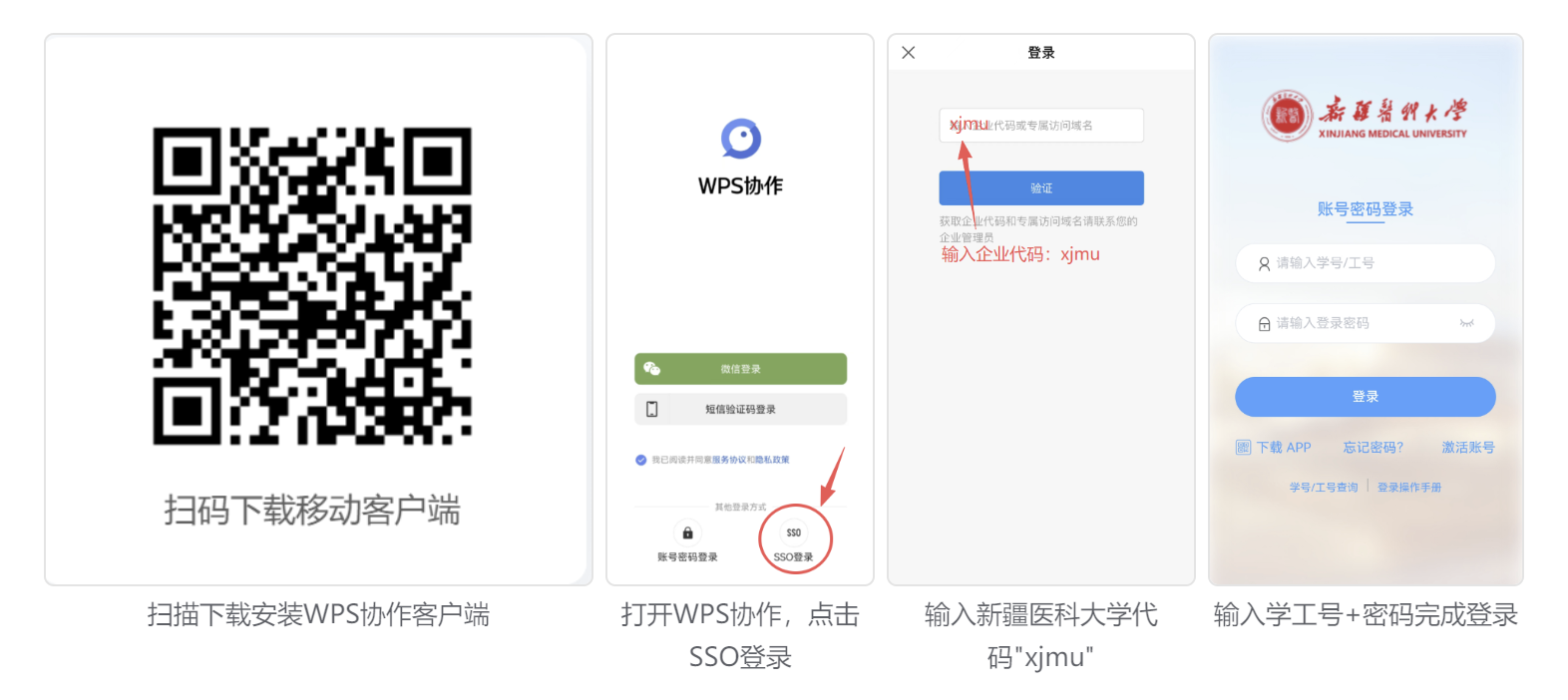 扫码下载安装WPS协作,选择SSO登录,输入Beat365中国唯一官方网站代码"xjmu",然后使用学工号+密码登即可。