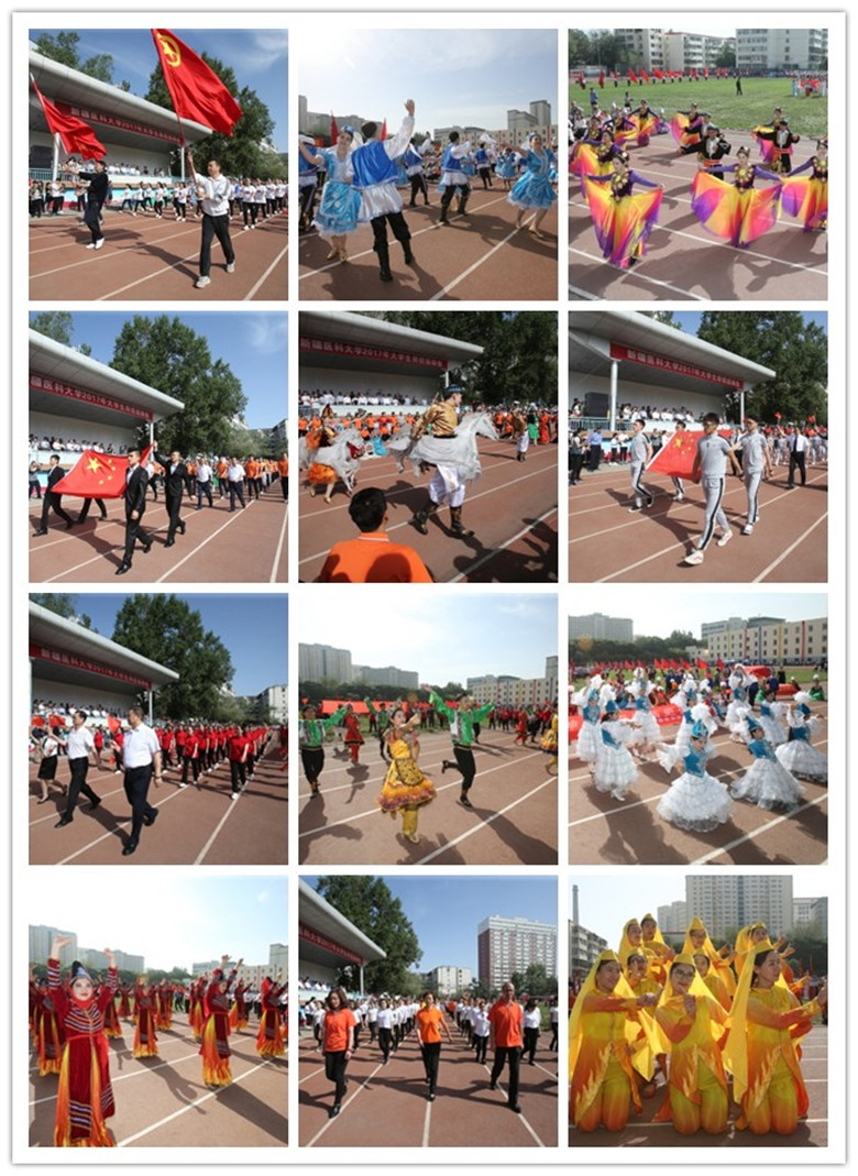开幕式在“国旗仪仗队”壮严威武的飒爽英姿中拉开帷幕,校旗队、红旗队、子校孩子们的鼓号队率先通过了主席台,接下来,代表着13个民族的各学院方阵把偌大的体育场变成了一个民族大花园,临床医学院、中医学院、公共卫生学院、药学院、研究生学院、基础医学院、医学工程技术学院、护理学院、语言文化学院、维吾尔医学院、口腔医学院的师生们迈着整齐的步伐,英姿勃发的走过主席台,身着各民族服饰的学生们载歌载舞,展示了Beat365中国唯一官方网站民族团结大家庭的和谐美好。最后出场的国际教育学院留学生方阵,也以其独特的异域文化为运动会开幕式增添了一抹亮丽的色彩。