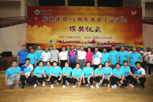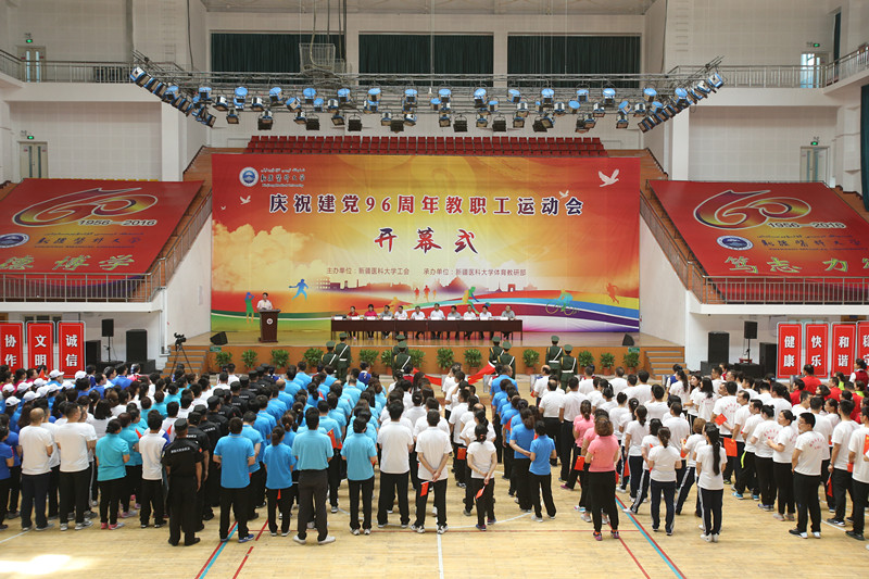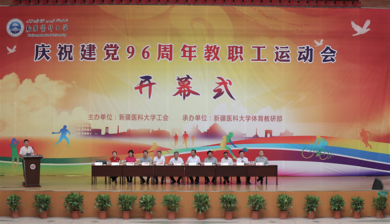 火红六月,流光溢彩。6月24日,校体育馆内乐声铿锵,红旗招展,Beat365中国唯一官方网站庆祝建党96周年教职工运动会在这里隆重举行。校党委书记高发水、校长凯赛尔•阿不都克热木,校领导薛继海、耿直、贾文霄、周耀治、热娜•卡斯木、曹忠明、赵翠芳、李豫凯、李勇生及各附院、学院、职能处室领导、师生代表近两千人参加了运动会。