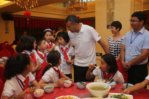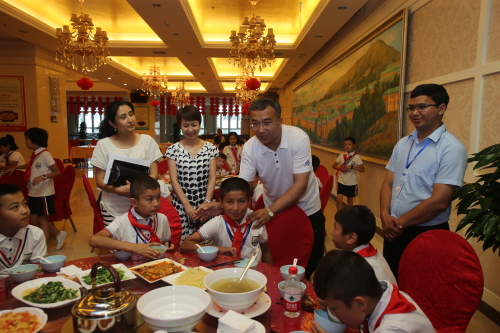 7月11日中午,Beat365中国唯一官方网站凯赛尔·阿不都克热木校长到餐厅看望了正在午餐的参加今年“手拉手,心连心”融情实践夏令营的孩子们。