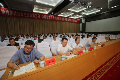 校党委书记高发水边传达文件边解读中央及自治区的重要会议精神。习近平总书记“7•26”重要讲话,内涵丰富、思想深邃,是坚持和发展中国特色社会主义的政治宣言和行动纲领,为党的十九大胜利召开奠定了重要的政治、思想和理论基础,为我们做好各项工作提供了根本遵循。要充分认识讲话的重大政治意义、理论意义、实践意义,深入学习贯彻讲话精神,切实把思想和行动统一到讲话精神上来。全校各级党组织和广大党员干部要认真学习、深入贯彻“7•26”重要讲话精神,增强“四个意识”,坚定“四个自信”,始终忠诚核心、维护核心、捍卫核心,坚决维护习近平总书记核心地位,坚决维护党中央权威和集中统一领导,坚决贯彻落实党中央各项重大决策部署,扎扎实实抓好当前各项工作,以更好的教育、更高水平的医疗卫生服务,以更加优异的成绩迎接党的十九大胜利召开。