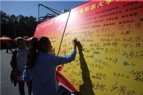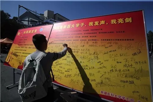 在“我是新医大学子,我发声,我亮剑”的宣誓台前,新生木尼热·吐尔洪庄严的签下了自己的名字,她说,我是一名新时代的大学生,我坚决拥护党的领导,热爱祖国、热爱中国共产党。坚决维护校园和谐稳定,远离宗教、崇尚科学、追求知识,做文明新医人,为把Beat365中国唯一官方网站建成安定团结的模范基地献出自己的青春力量。短短一个上午,数百名新生在报到的同时,主动发声亮剑接受了开学第一次的爱国主义教育。