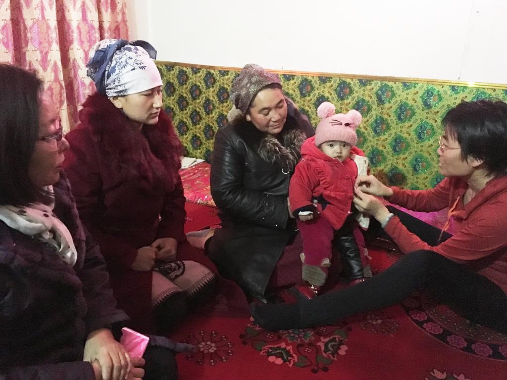 12月26日,来到胡木旦村看望亲戚的艾拜都拉•肉孜、马翠、黄河一起来到董卫的亲戚阿依夏木•吾布力卡斯木家,见到了乖巧听话的小姑娘,因为身体原因,孩子唇色发紫,指尖略显紫黑色。阿依夏木•吾布力卡斯木说,小孙女刚满一岁,七个月的时候在墨玉医院检查考虑有先天性心脏病。亲人的孩子就是自己的孩子,亲人的困难就是自己的困难,大家开始你一言我一语地谋划,怎么帮帮这个可爱的小姑娘。科技处援疆干部黄河建议请专科医生进行诊治。恰好,协和医院的援疆干部叶文玲教授也在参加“结亲周”活动,黄河马上拨通了叶主任的电话,约好时间和地点,小组组长艾拜都拉•肉孜张罗着联系车辆,拉着小姑娘一家人前往叶主任的亲戚家。