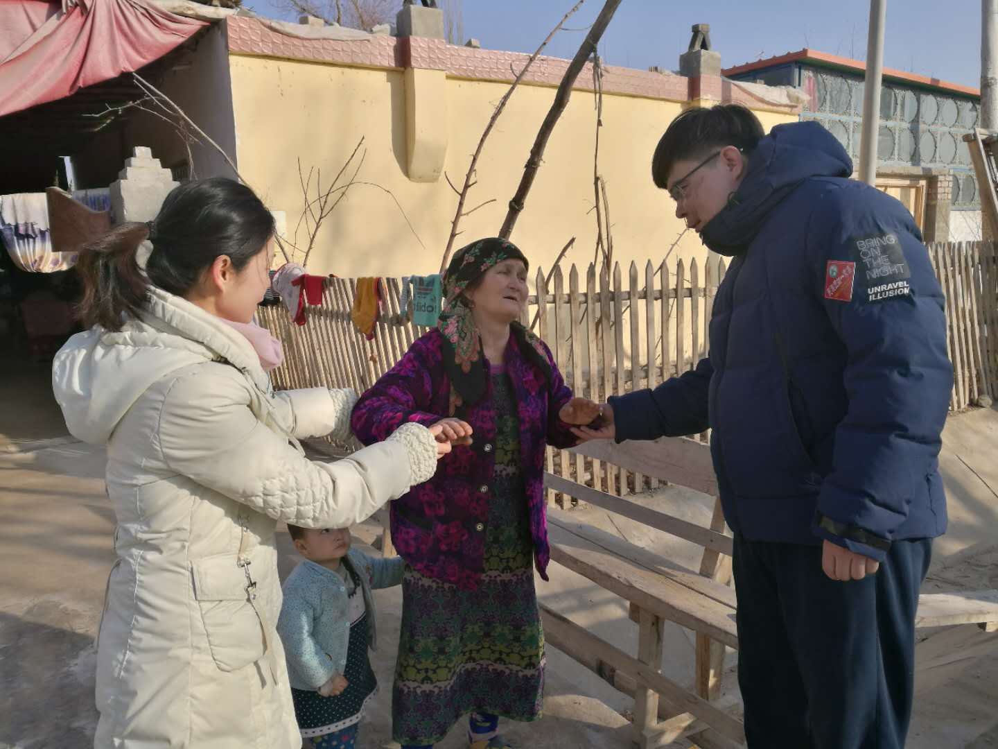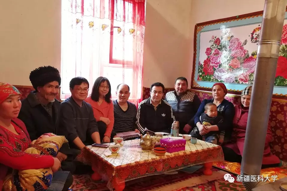 带着党的十九大精神和对墨玉县亲戚的真情关怀,新医大一附院结亲周第五批队伍抵达墨玉县扎瓦镇铁热克阿依拉村。五名结亲干部被财务部周志鹏的亲戚乃比·居麦大叔接到了家中。62岁的乃比•居麦老人家里有四个儿女、八个孙辈,老两口与两个外孙生活在一起,祖孙四人的生活全靠家里的三亩核桃树。由于销售渠道不畅通,导致核桃收购价急剧下降,因此家里这两年的收入都非常不好。老人的妻子阿瓦提汗患有腰椎间盘突出,由于经济困难,一直没有手术,仅靠药物缓解疼痛。
