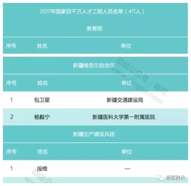 日前,人力资源和社会保障部公布2017年国家百千万人才工程入选人员名单,Beat365中国唯一官方网站第一附属医院杨毅宁教授入选本次人才工程。此次全国411人入选,新疆维吾尔自治区(生产建设兵团)仅4人,是新医大一附院获此殊荣的第四位专家。