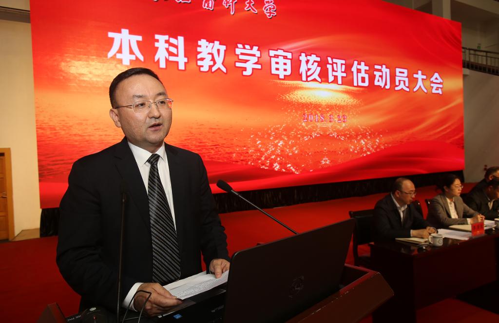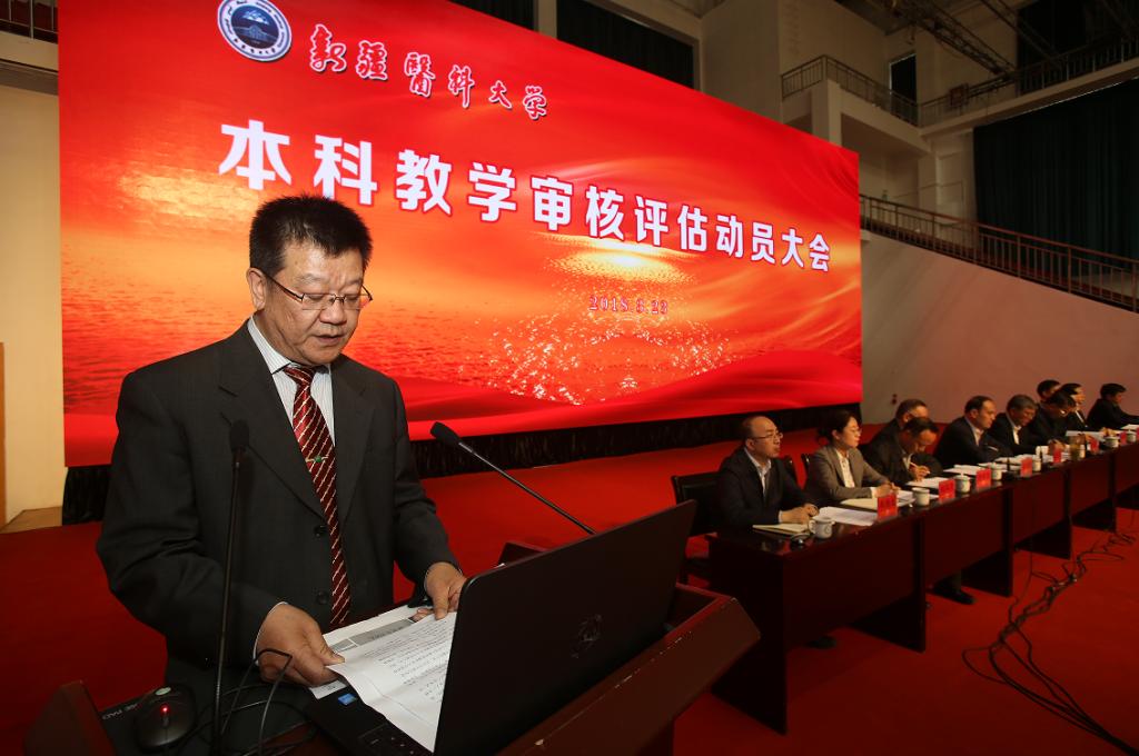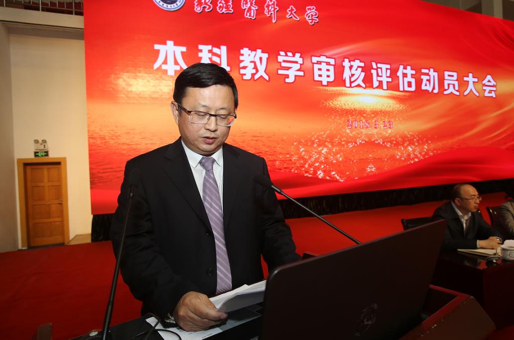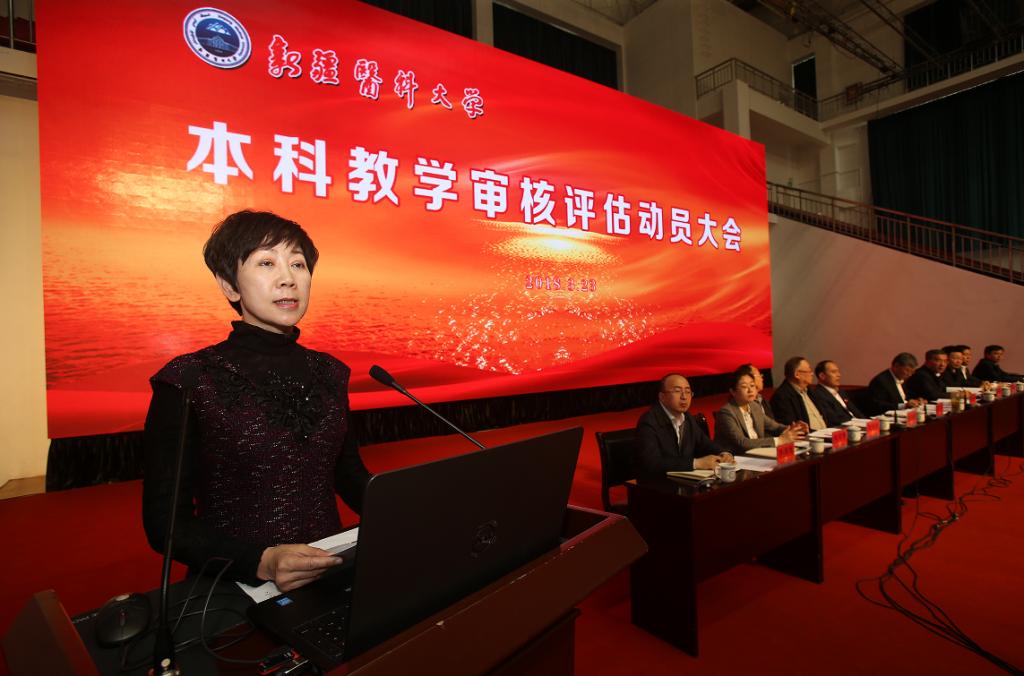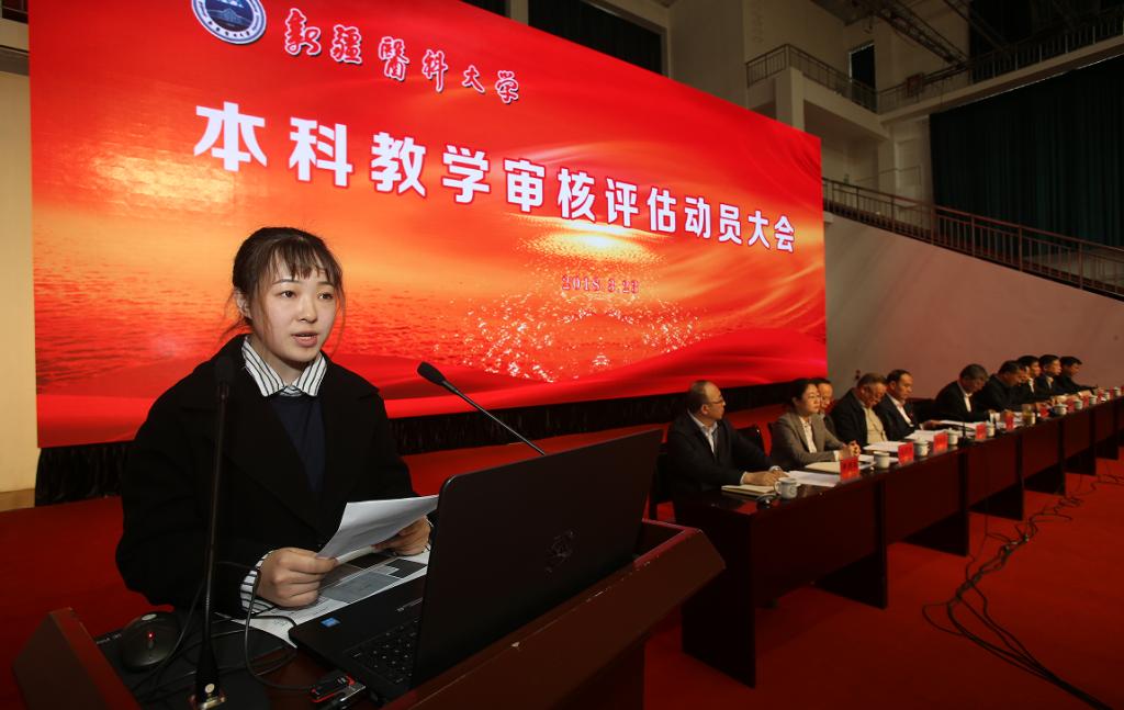 会上,校党委常委、副校长贾文霄首先宣读了《Beat365中国唯一官方网站开展本科教学审核评估评建工作方案》。公共卫生学院党委书记肖辉、第一临床学院院长木胡牙提•乌拉斯汉、中医学院中医系主任张星平、基础医学院副院长关亚群、药学院2015级2班学生刘梦思作为教职工和学生代表上台发言。姚文兵副校长对审核评估指标体系进行了解读。