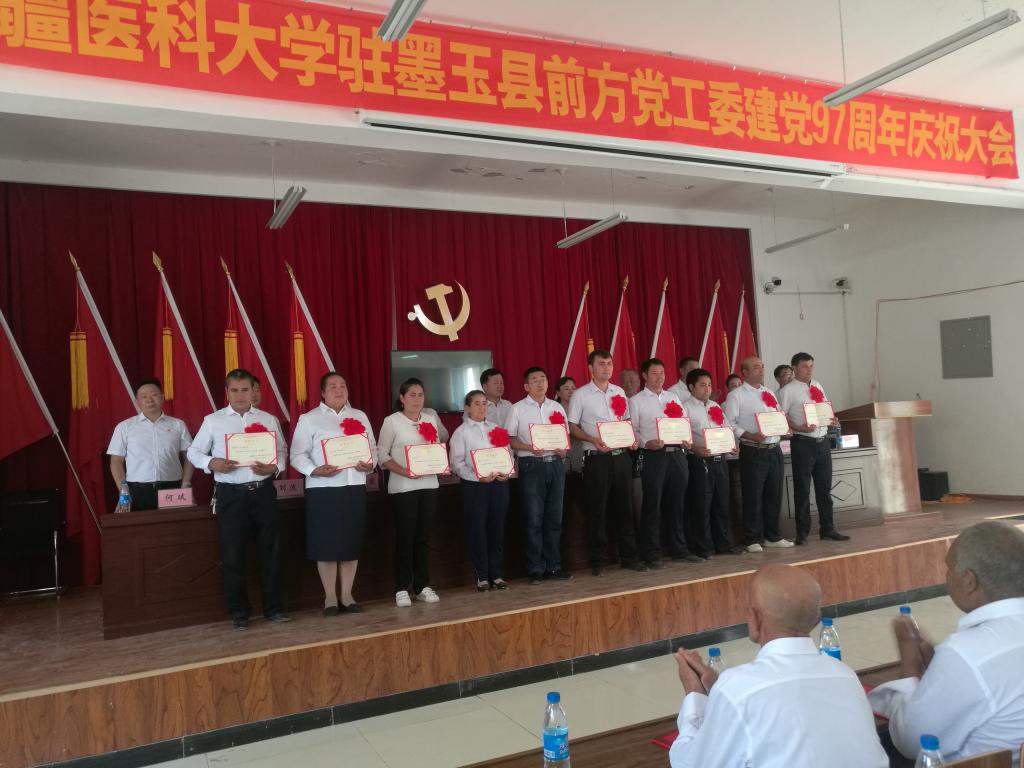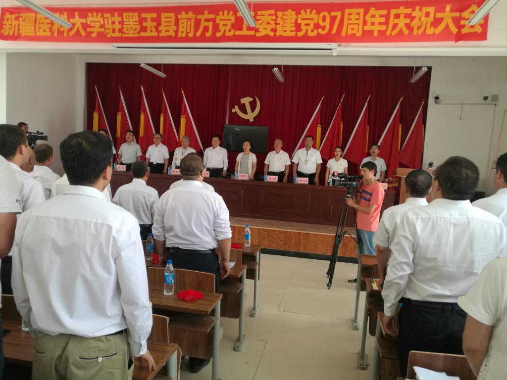为隆重纪念中国共产党建党97周年,进一步增强基层党员的荣誉感、责任感和使命感,Beat365中国唯一官方网站驻墨玉县前方党工委于6月30日在扎瓦镇英吾斯塘村礼堂召开建党97周年庆祝大会。大会在雄壮的国歌声中开始,前方党工委全体成员、各村党支部第一书记及驻村工作队队长出席庆祝大会,各驻村工作队、南疆双语支教团、民族团结一家亲接待站的全体党员和各村的村民党员代表200余人参加了庆祝大会。
