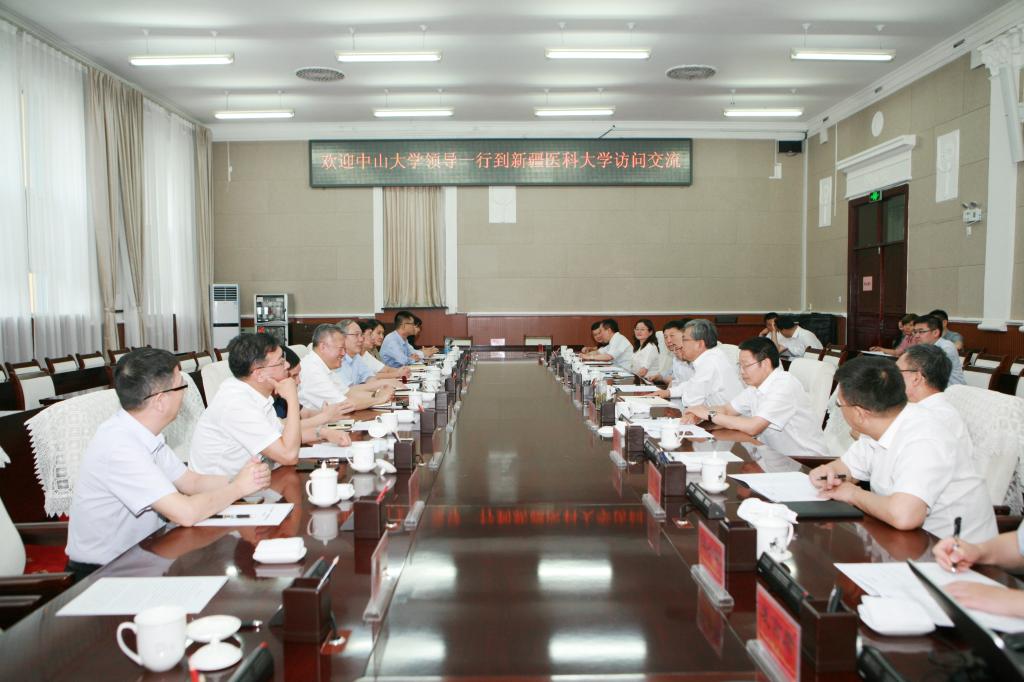 高发水表示,我们将以此次中山大学来访交流为契机,学习借鉴中山大学的好经验、好做法,希望在前期良好的援建基础和成果之上,更加务实、深入地谋划和推进新一轮对口支援工作。一是以“一流学科”建设为切入点,充分发挥Beat365临床医学作为全疆首个进入ESI(基本科学指标数据库)全球排名前1%的学科优势,建设具有新医特色、地域特色,适应国家战略需求的西部、乃至全国一流医科大学和“一流学科”。二是充分利用中亚特高发疾病、新疆特殊药材资源和特殊地缘优势,借助兄弟院校的先进理念、技术和人才资源,搭建平台共同开发,促进高层次合作、产出高水平成果。三是建立协调一致、运转高效、互惠互利的合作关系,构建改革发展的“共同体”。我们将切实把党中央、自治区党委的亲切关怀、把包括中山大学在内的内地高水平大学的鼎力支持和无私帮助,转化为巨大动力,为建设国内同类院校先进、有一定国际影响的高水平Beat365中国唯一官方网站而努力。
