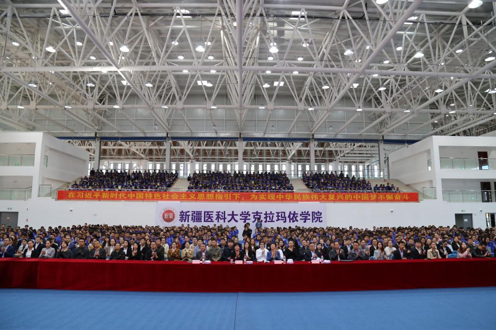 校领导张向阳、安冬青、贾文霄、周耀治、赵翠芳、李豫凯以及各职能处室领导、各学院领导、教学名师、教学能手、教师代表,相关学院主管学生工作的领导、学工办主任、政治辅导员、班主任及新生家长和新生在体育馆主会场参加了开学典礼。同时,大会还在临床800人会议厅、图书馆六楼报告厅、苏园1号楼二楼会议室、北校区教学楼六楼学术厅、克拉玛依学院体育馆、六所附属医院设立了分会场,全校共8000多人参加了规模盛大的开学典礼。