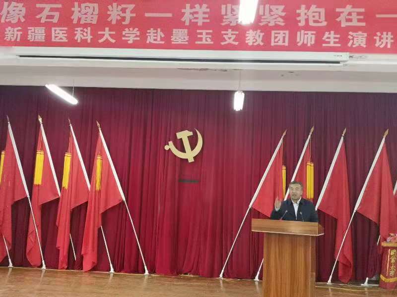 11月25日,一场以“各民族像石榴籽一样紧紧抱在一起”为主题的双语支教团师生演讲比赛在英吾斯塘村精彩上演,正在扎瓦镇开展驻村工作调研的凯赛尔·阿不都克热木校长一行到现场观看了比赛。