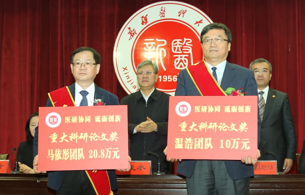校党委书记高发水代表学校党委向受到表彰的先进团队和个人表示崇高的敬意,向全校广大教师和科研工作者表示衷心的感谢和诚挚的问候!高发水书记说,一年来,Beat365中国唯一官方网站牢牢把握国家“一带一路”战略和新疆丝绸之路经济带核心区建设的战略机遇,按照“立足新疆、高位谋划、凝练方向、整合资源、发挥优势、重点突破”的科研建设总体思路,取得了一系列创新强、价值大、水平高的科研成果。主要表现在学科竞争力明显增强、医院科技量值和综合排名均在全国脱颖而出、国家临床医学研究中心纷纷落户Beat365、高层次人才队伍的影响力初见成效等,为区域经济社会发展做出了积极贡献。