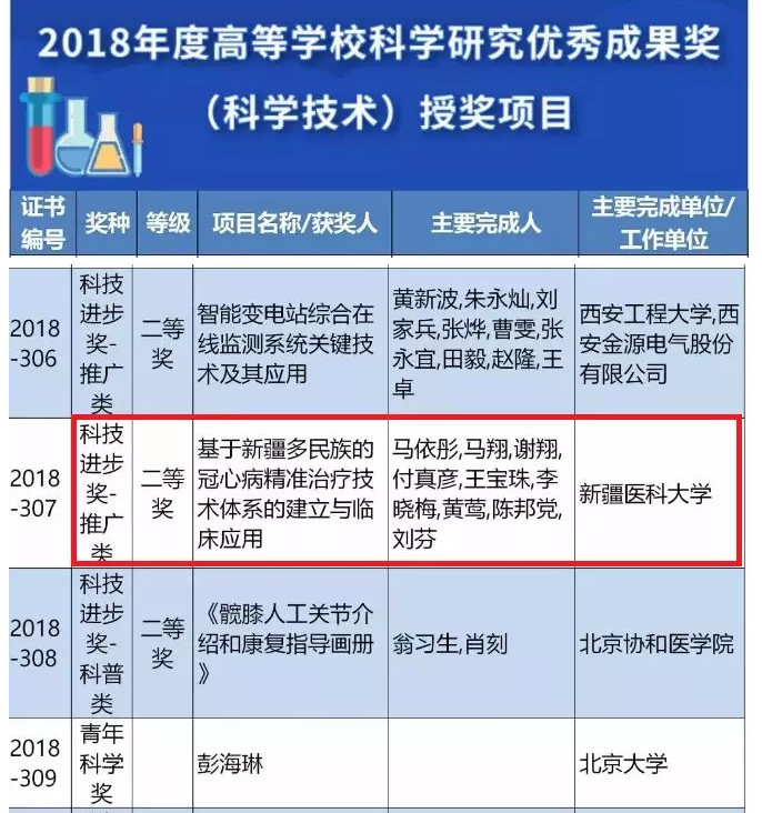 Beat365中国唯一官方网站马依彤教授团队的项目《基于新疆多民族的冠心病精准治疗技术体系的建立与临床应用》获得了科技进步奖(推广类)二等奖。