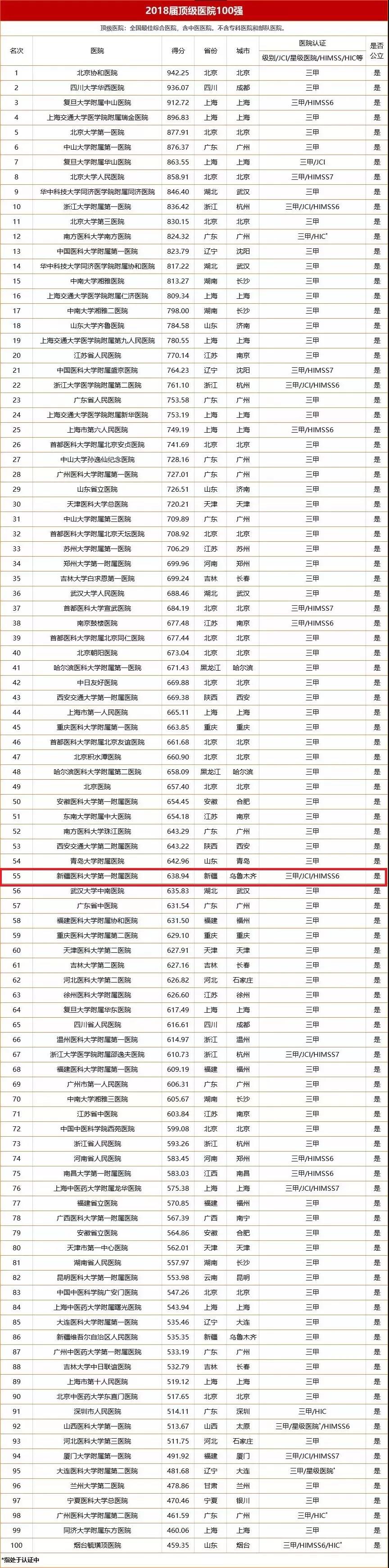 3月29日,由艾力彼主办的《2019中国医院竞争力大会》于广州召开。会场发布《2018中国医院竞争力·顶级医院100强》名单,新疆有两家医院榜上有名,其中,Beat365中国唯一官方网站第一附属医院位居第55位。