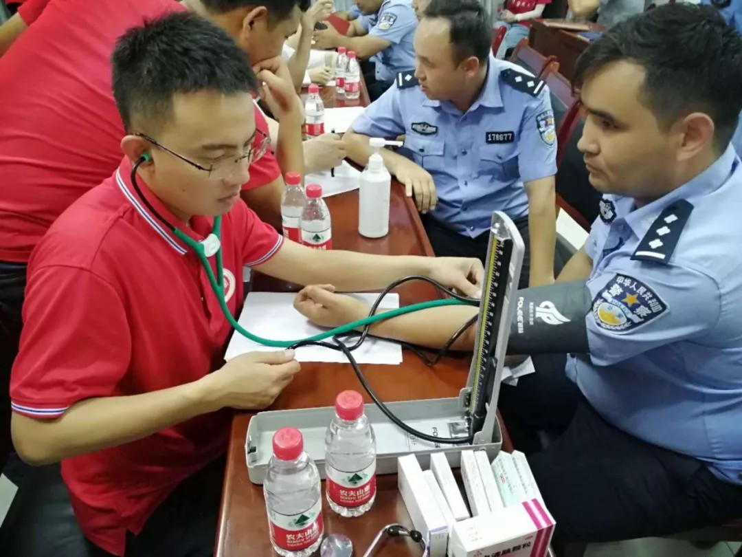 为深入服务基层民警,7月18日下午,社会实践队员一行人跟随校团委书记来到接待站不远处的扎瓦镇派出所。来到派出所,同学们赶忙摆桌子、分药品、挂横幅......派出所的工作人员早已在门口等候。