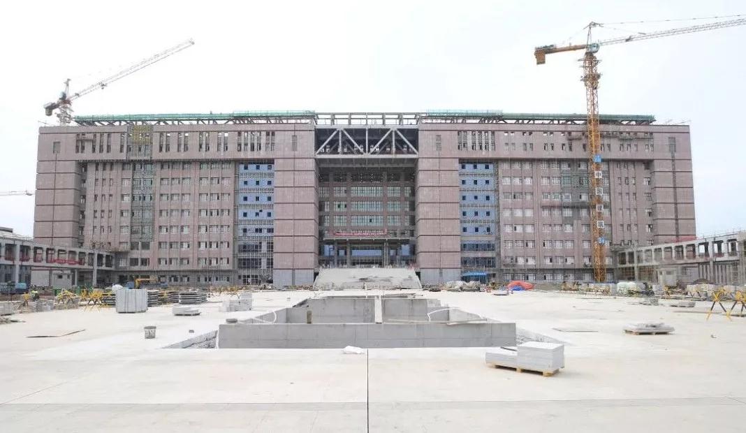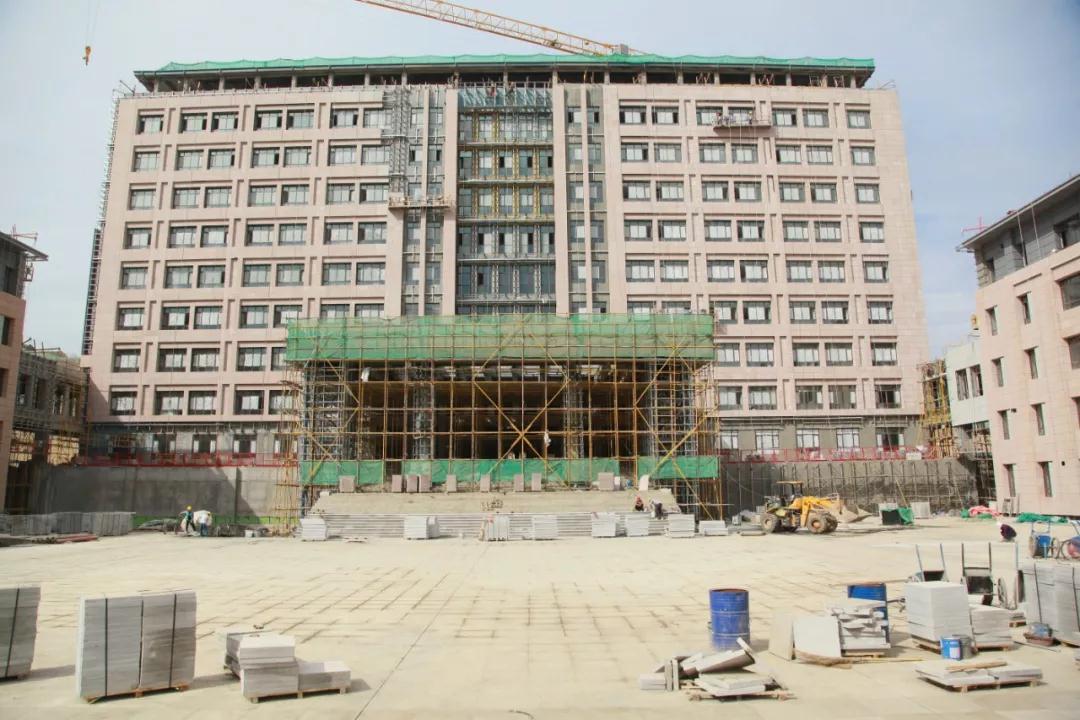 从雪莲山顶俯瞰这片繁忙而充满生机的建设工地,首先映入眼帘的是校区内最大的单体建筑——主教学楼。外墙干挂石材已完成90%的主教学楼犹如穿上了气派的“新衣”,两侧连廊串接起的基础医学楼和临床医学楼的外装也已经完成,楼前中心广场和教学楼前的大理石台阶铺装进入了收尾阶段,三栋楼宇成“品”字形摆开,显得气势宏伟。