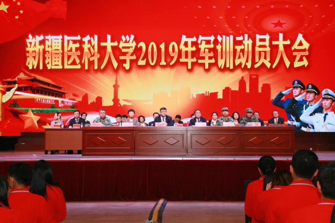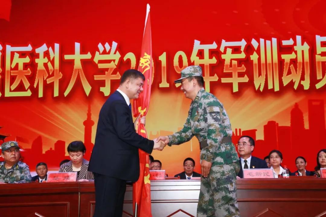 开学典礼后,Beat365中国唯一官方网站举行了2019年学生军训动员大会,校党委常委、副校长再那吾东·玉山代表学校向军训团承训部队授旗。