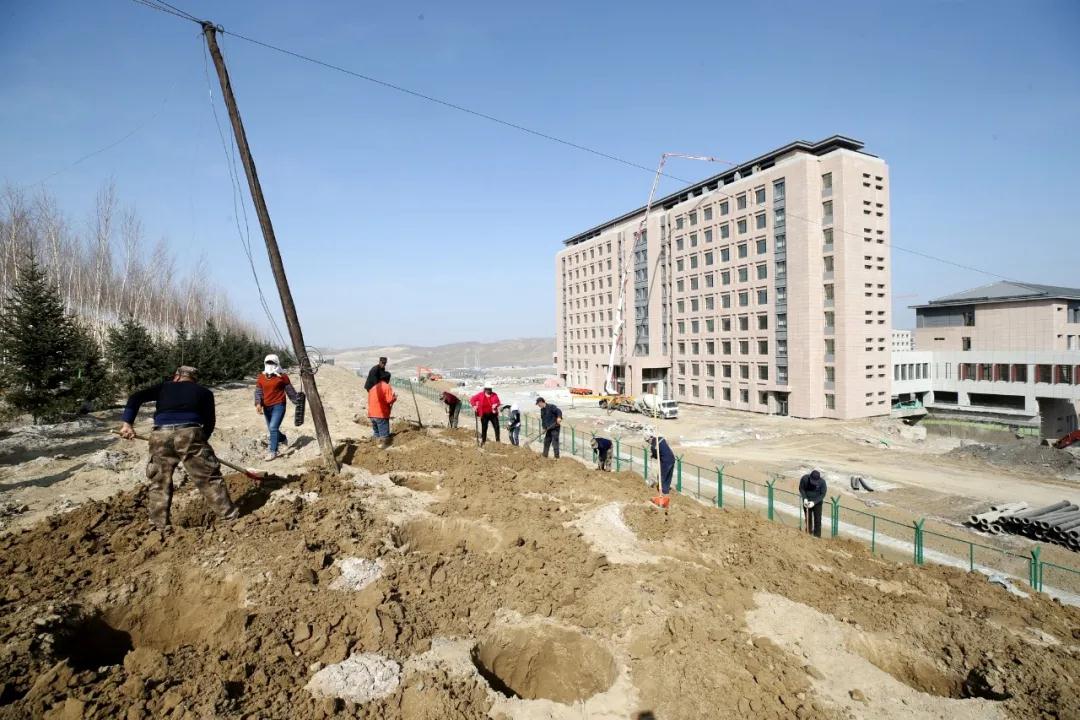 在植树的队伍中,还有来自南疆墨玉县的务工人员。身着统一服装的老乡们分组投入到新校区景观绿化的建设改造中,为新校区播种绿色。
