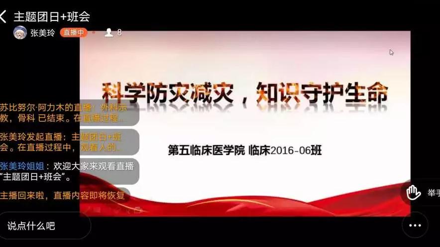 在此次班会中,围绕“提升基层应急能力,筑牢防灾减灾救灾的人民防线”的主题,学院均制作了防灾减灾教育PPT,播放防震自救、消防自救互救宣传片,组织学生参加2020防震减灾网络知识竞赛活动。第三临床医学院邀请驰援武汉医疗队队员、“三进两联一交友”老师展翼翼联系当前疫情防控实际,开展防灾减灾知识宣讲,告诉同学做好充足的知识储备,才能尽可能的降低其所带来的伤害。医学工程技术学院邀请乌鲁木齐市消防工程师、职业技能培训学校副校长张文斌老师做防灾减灾救灾讲座并向全院学生进行线上直播,通过观看实例视频、示范逃生正确动作,进一步提高同学们的防患意识和火灾自救能力。第五临床医学院、第一临床医学院以班级为单位开展防灾减灾的知识竞赛,护理学院、第六临床医学院、第一临床医学院组织开展防灾减灾手抄报制作活动。