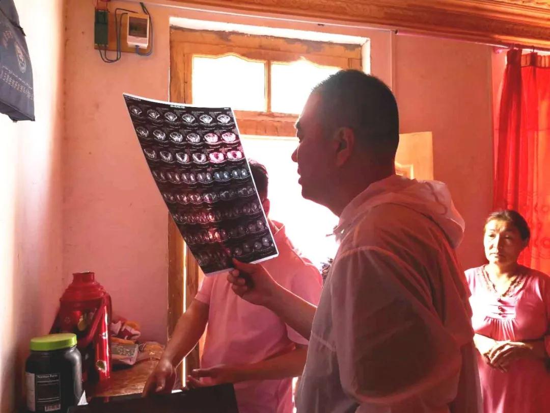 援疆干部充分发挥专业优势,利用结亲走访开展义诊活动。援疆干部祁宝昌是一位骨科专家,听说托格拉克村有一位老乡曾遭遇车祸患者后,特地赶到村里察看病情,仔细阅看一张张片、CT片,及时为患者提出了下一步治疗建议,并主动留下联系方式方便家属联系。患者家属感动的热泪盈眶,临走时小步追赶着硬要塞给水果和鸡蛋,以表心中感激,祁宝昌对他们说:“不用感谢我们,因为我们是一家人。”一路上,老乡们频频向我们挥手致谢,孩子们有稚嫩的声音向我们问好。