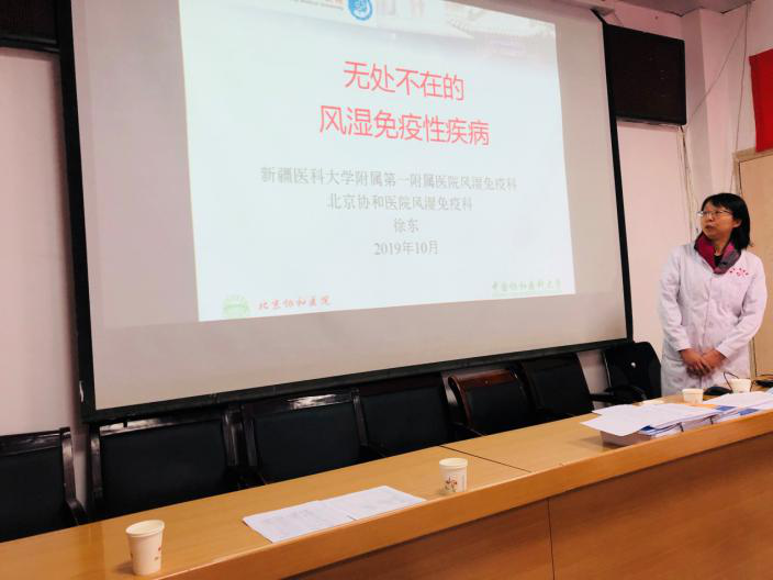 在“走出去,引进来”这一理念的引导下,徐东主任通过援疆工作,搭建了Beat365中国唯一官方网站第一附属医院与北京协和医院合作交流平台,邀请北京协和医院风湿免疫科专家来疆授课,与疆内风湿免疫同行现场答疑交流,扩大了医院风湿免疫科在疆内风湿病领域的影响力。同时协调科室临床医生共同参加了2019年北京协和医院风湿免疫科举办的学习班培训,现场与专家交流互动,相互学习、共同提高,促进新疆地区风湿免疫学科发展。
