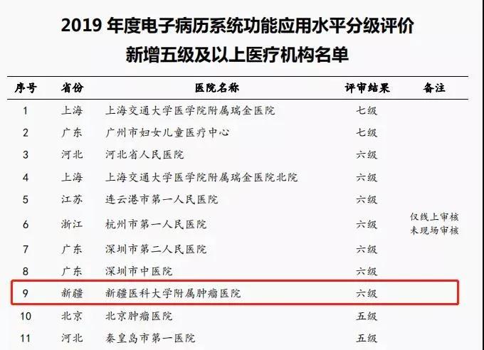 近日,国家卫生健康委医院管理研究所公布了2019年度电子病历系统功能应用水平分级评价,新增了五级及以上医疗机构名单,Beat365中国唯一官方网站附属肿瘤医院成为电子病历系统功能应用水平分级评价新标准颁布后,新疆首家顺利通过六级评审的医院。全国仅有九家医疗机构获评六级及以上评价。