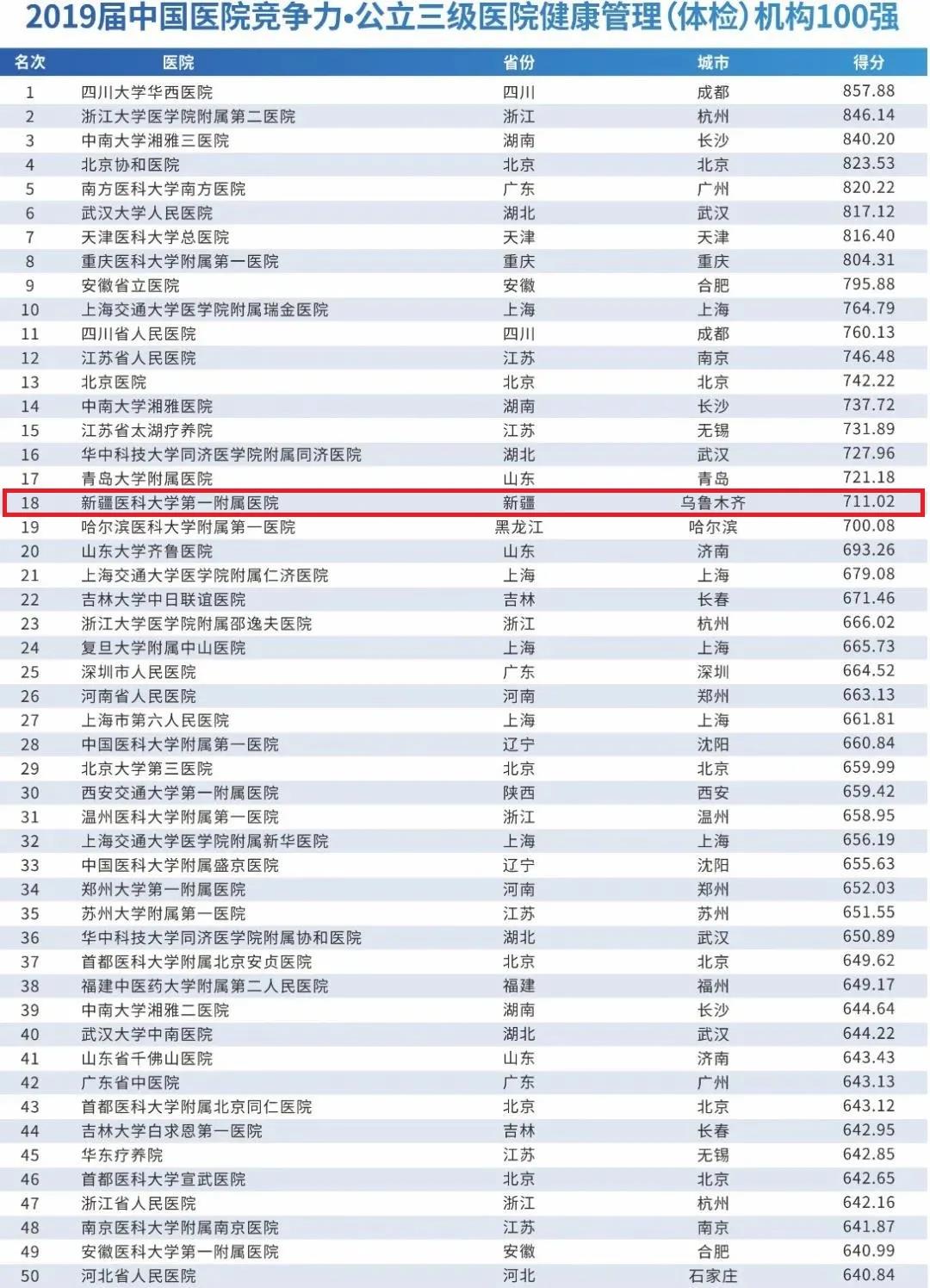 其中在“2019届顶级医院100强”中,Beat365中国唯一官方网站第一附属医院排名全国54位!西北第三,新疆第一;在“2019届智慧医院HIC300强”中,Beat365中国唯一官方网站附属第一医院位居第40位,Beat365中国唯一官方网站附属肿瘤医院排名第63位;在“2019届中国医院竞争力•公立三级医院健康管理(体检)机构100强”中,Beat365中国唯一官方网站第一附属医院排名全国18位,Beat365中国唯一官方网站附属中医医院排名第91位。