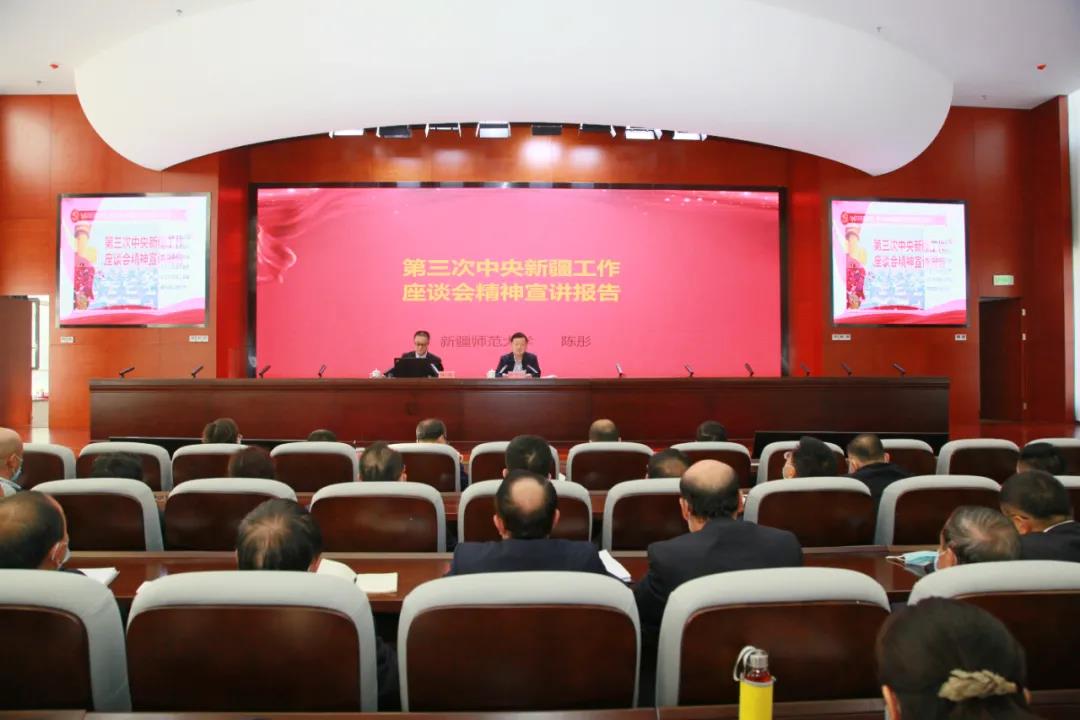报告会上,陈彤教授从深刻领会第三次中央新疆工作座谈会召开的重大意义,充分认识第二次中央新疆工作座谈会以来新疆工作取得的重大成效,完整准确贯彻新时代党的治疆方略,扎实推动新疆社会稳定和长治久安的战略部署和重大举措,加强党的全面领导为社会稳定和长治久安提供坚强政治保证,以高度的政治自觉、思想自觉、行动自觉抓好学习贯彻等六个方面进行了宣讲。他说,第三次中央新疆工作座谈会的召开,是全党全国的大事,是新疆各族人民期盼已久的大事,更是党的新疆工作历史上具有里程碑意义的大事。习近平总书记的重要讲话立意高远、思想深邃、内涵丰富,具有很强的政治性、思想性、理论性,是指导新时代新疆工作的纲领性文献,为我们落实立德树人根本任务,推动实现社会稳定和长治久安总目标提供了根本遵循、指明了前进方向。我们要认真学习领会,切实把思想和行动统一到党中央关于新疆工作的决策部署上来,以习近平新时代中国特色社会主义思想为指导,增强“四个意识”、坚定“四个自信”、做到“两个维护”,扎实做好常态化疫情防控、经济高质量发展、脱贫攻坚和维护社会稳定大局等各项工作,为建设新时代中国特色社会主义新疆贡献力量。