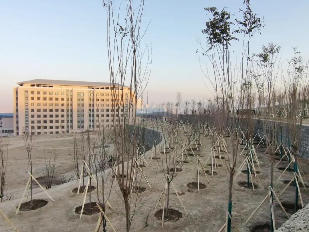 今年秋季,雪莲山校区的植绿突出了造景的功能,校区西门外的大叶白蜡整齐排列、迎风招展,海棠路两旁各类海棠花开四季,一步一景。行道树的栽植结合新校区每条道路的景观特色,给人以“一路一树,一路一景”的视觉享受。教学楼、学生公寓楼和图书馆周边的树木栽植与周边环境有机融合,各色形态不一的乔木与建筑构成和谐的整体,造就了“一点成景”的观赏效果。远山广场的北坡坡面以香花槐、红叶海棠为映衬,不同种类的乔木行列式栽植,错落有致,打造花开四季、姹紫嫣红的迷人美景。壮志、凌云桥两边的山桃和湖边的柳树相互映衬,“桃红柳绿、下自成蹊”,别有一番韵味。