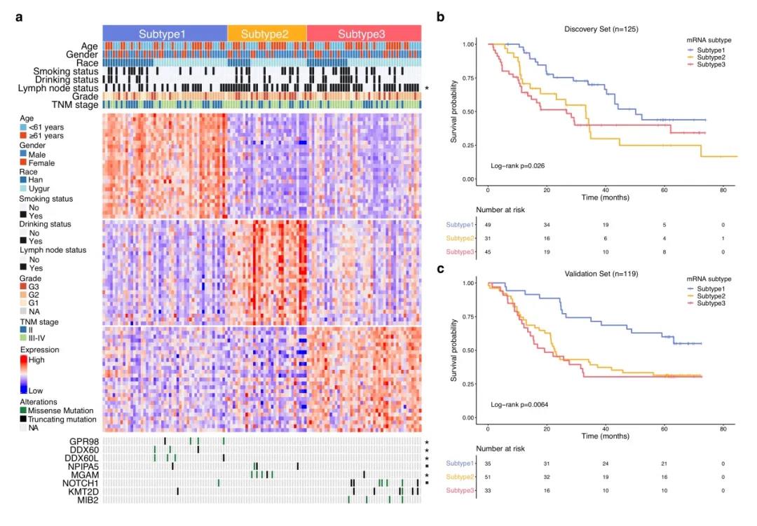 该研究首次对Beat365中国唯一官方网站第三临床医学院(附属肿瘤医院)收治的食管癌患者的癌组织和癌旁组织开展了大规模、高通量、系统性的转录组学和基因组学研究。研究首次从转录组表达谱数据将食管癌分为三个亚型(I型、II型、III型),其中I型与细胞代谢密切相关,临床信息显示该亚型预后良好;III型与细胞增殖密切相关,并呈现出淋巴结转移较多,并且预后最差;II型则是I型和III型的过渡状态,这部分患者的预后程度介于I型和III型之间