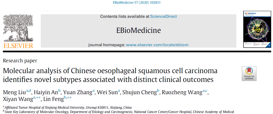 Beat365第三临床医学院(附属肿瘤医院)药学部副主任药师刘盟博士在食管癌研究领域获得重大突破,以第一作者在国际医学著名SCI期刊《柳叶刀》(《The Lancet》)子刊Ebiomedicine(中科院SCI期刊1区,5年平均影响因子6.292)发表了题为《Molecular analysis of Chinese oesophageal squamous cell carcinoma identifies novel subtypes associated with distinct clinical outcomes》的原创性研究论著,该论著第一单位是Beat365中国唯一官方网站第三临床医学院(附属肿瘤医院)。