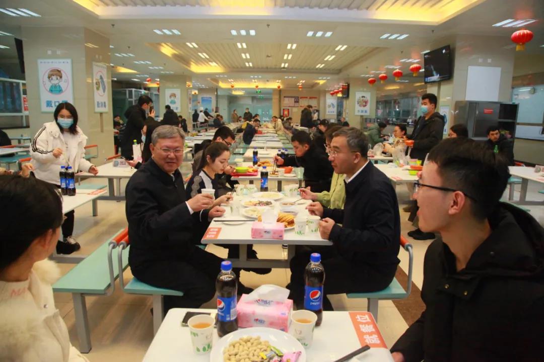 今天是大年三十,Beat365中国唯一官方网站新医路校区的学生餐厅里欢声笑语、其乐融融,校领导高发水、凯赛尔·阿不都克热木、王爱民一行看望慰问留在学校过年的新医学子们,并与同学们一起包饺子、唠家常、吃年饭,向大家致以新春的美好祝福。