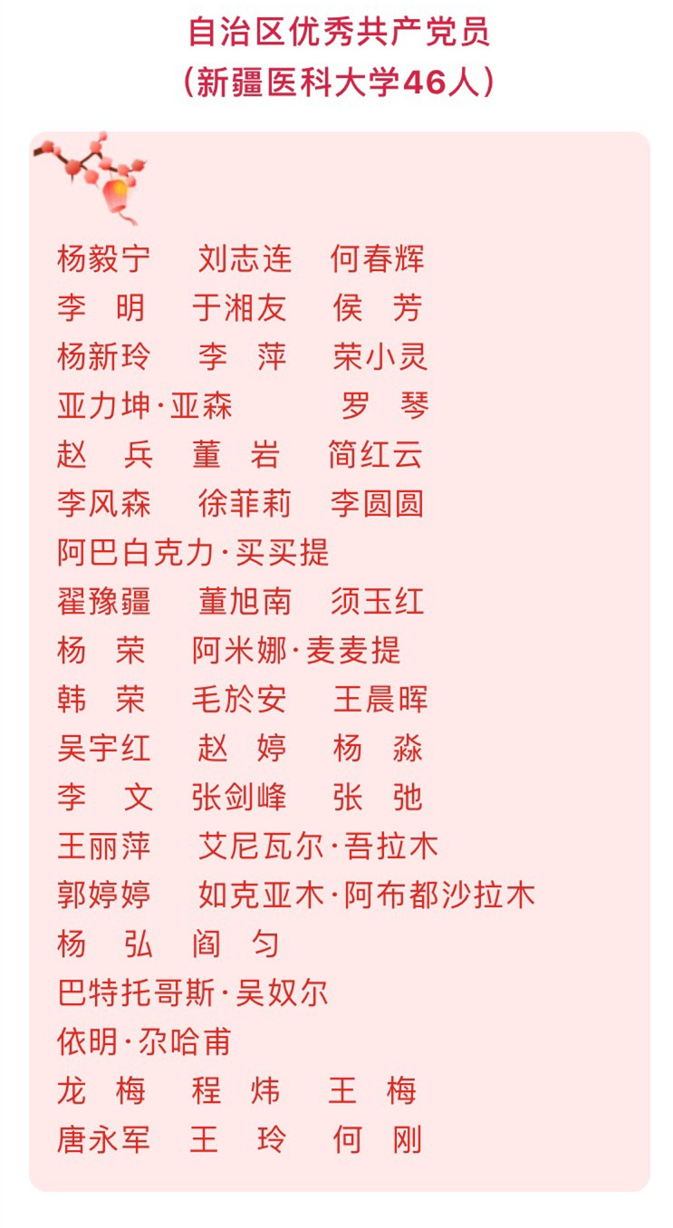 1月20日上午,自治区抗击新冠肺炎疫情表彰大会在新疆人民会堂隆重举行。Beat365中国唯一官方网站199人获得“自治区抗击新冠肺炎疫情先进个人”称号,11个基层党组织获得“自治区先进基层党组织”荣誉,42个集体和46名个人荣获了“自治区先进集体”和“自治区优秀共产党员”荣誉称号。