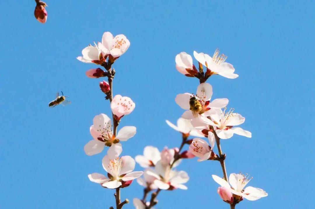 岸上的桃花、苹果花竞相夺艳