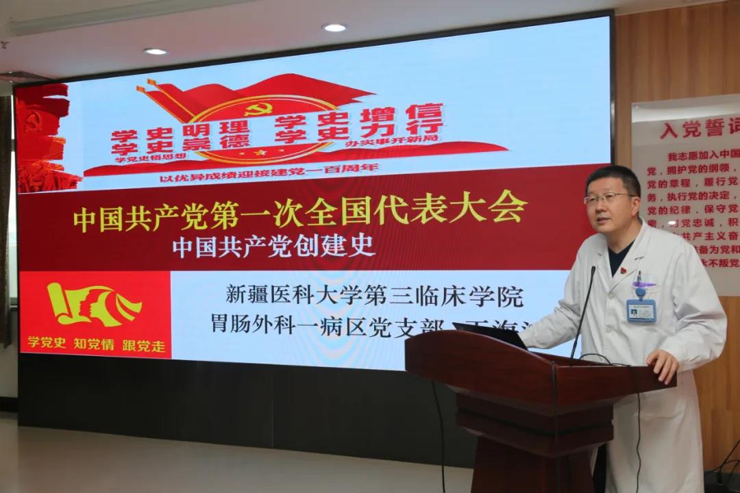 前不久,全国高校“双带头人”教师党支部书记工作室、第三临床医学院(附属肿瘤医院)胃肠外科(一病区)党支部书记王海江围绕“中共一大”的党史故事,给大家带来了一堂内涵丰富、精彩生动的高质量党课。