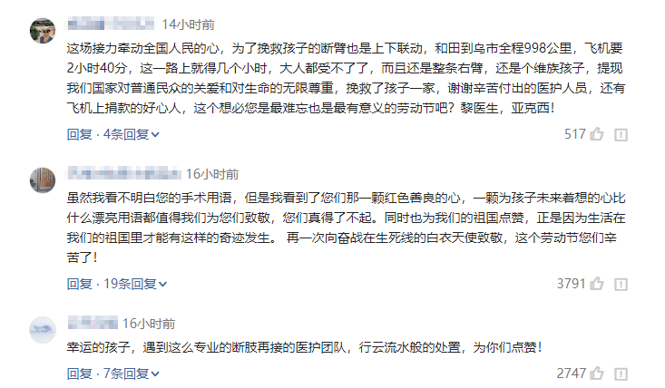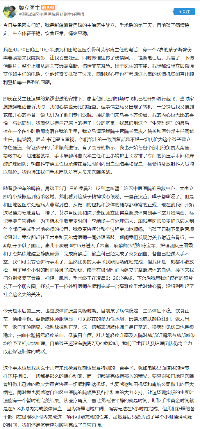 5月4日9时30分,和田受伤男孩术后第三天,Beat365中国唯一官方网站附属中医医院组织多学科专家团队对孩子病情进行了会诊,针对术后抗感染,加强营养、护理,保护重要脏器损伤等方面给出详细治疗方案,尽最大努力为和田受伤男孩平稳度过风险期,让接上的断肢成活,让孩子回归正常生活。