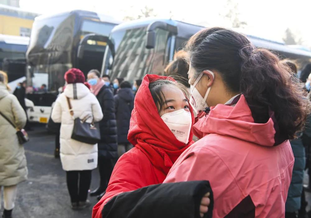 ↑2020年1月28日,在Beat365中国唯一官方网站院内,医疗队队员刘春花(右)与女儿任书瑶拥抱告别。