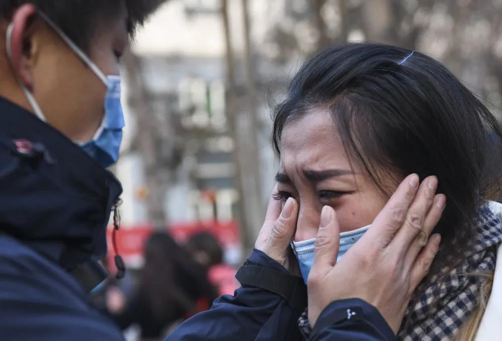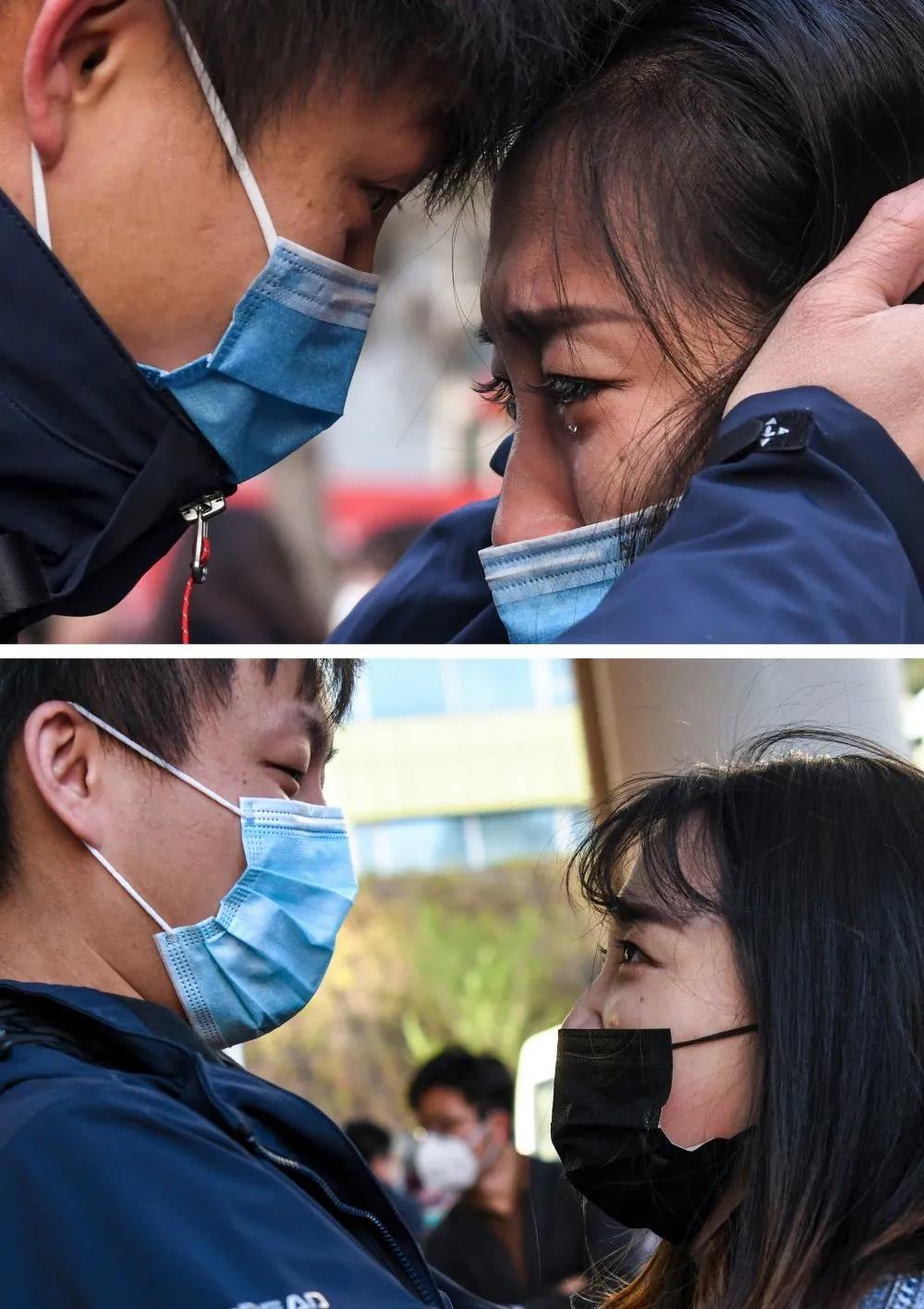↑2020年1月28日,在Beat365中国唯一官方网站院内,医疗队队员、Beat365中国唯一官方网站第一附属医院重症监护室医护人员吕俊(左)为未婚妻王鹤擦去眼泪。