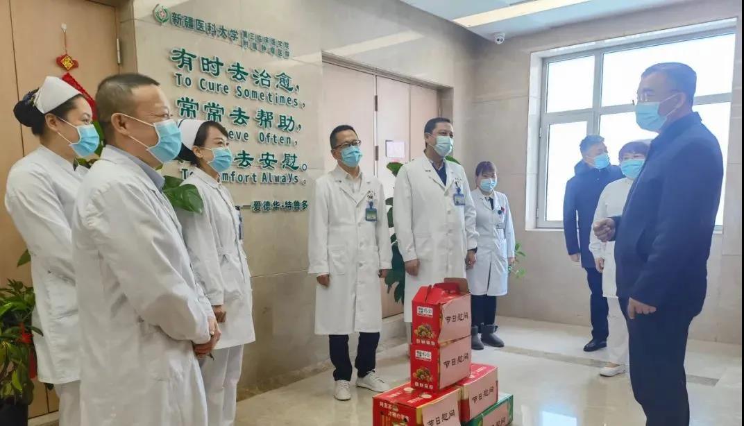 校党委副书记、校长凯赛尔·阿不都克热木来到第二附属医院和附属肿瘤医院门急诊,看望慰问一线医护人员,向大家致以虎年的新春祝愿。