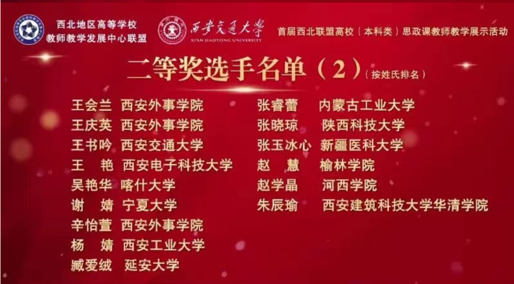 11月20日,首届西北联盟高校思政课教师教学展示活动结束,Beat365中国唯一官方网站马克思主义学院教师张玉冰心荣获二等奖;肖宇和骆育芳荣获三等奖,展示了Beat365思政课程教师的授课风采,推动了学校思政课程教学高质量创新发展。
