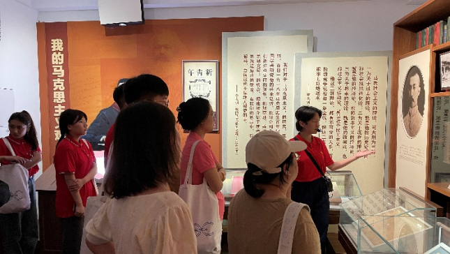 研学团走进北大红楼,重温觉醒年代。北大红楼同建党历史紧密相关,是我国最早研究和传播马克思主义之地。同学们通过手中的镜头,捕捉着青年学子对红色文化的印象和感悟。《新青年》北京编辑部旧址,蔡元培办公室复原场地,《启蒙者》油画,《八大同人编辑》浮雕...同学们一边认真听讲解,一边用手机拍摄记录。王锋同学感慨地说,“我喜欢主持和宣讲,回到学校后,希望通过自己的声音,向大家去讲述这些真实的历史故事,传播先辈的革命精神。”