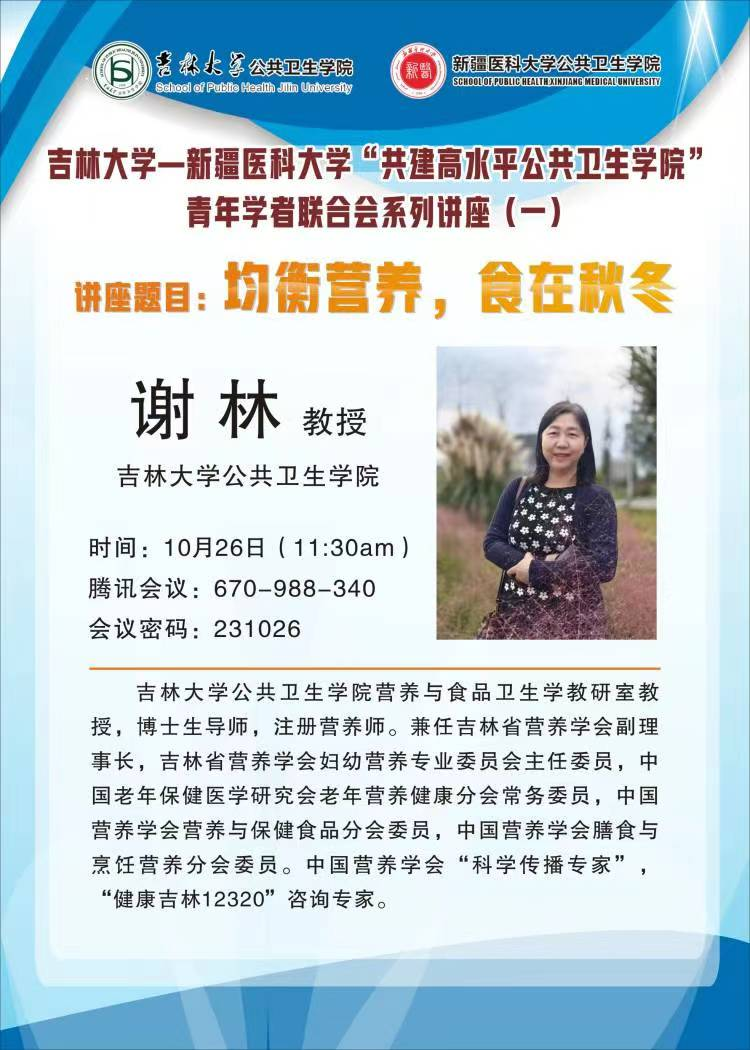 10月26日,Beat365中国唯一官方网站公共卫生学院青年学者联合会第一期学术交流活动顺利举行,活动邀请到吉林大学公共卫生学院营养与食品卫生教研室谢林教授。
