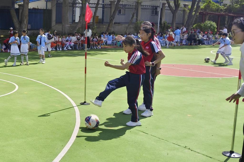 本届足球节以“全员参与、多元发展”为理念,设置技巧类挑战赛与班级联赛。技巧项目中,一、二年级开展运球接力、抱球夹球等趣味活动,三、四年级增设障碍射门、坐地夹球接力,五、六年级挑战曲线运球与点球大战。赛场上,小球员们灵活运球、精准射门,欢呼声与掌声此起彼伏。班级联赛采用5人制,通过淘汰赛与交叉淘汰赛决出冠亚季军,三、四年级“四4班对阵三4班”、五、六年级“六4班对阵 六1班”的对决更是精彩纷呈。