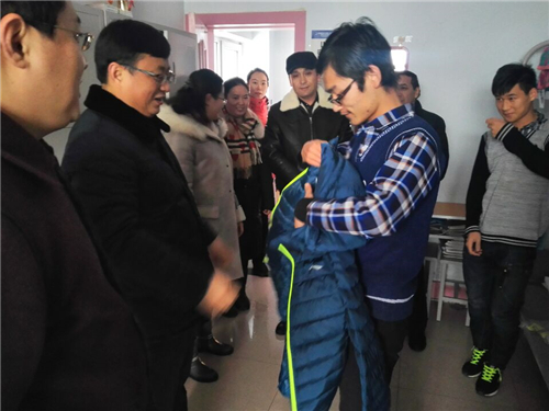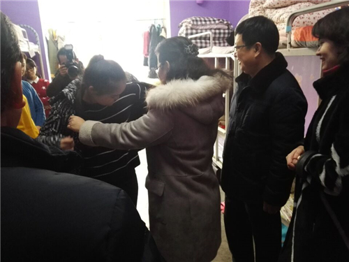 12月29日中午,耿直副校长,学生处领导,公共卫生学院领导及辅导员、班主任,来到女生4号公寓楼和7号和9号公寓楼发放冬衣,受助同学穿上时尚、合身的冬衣,都露出开心的笑容,有人提议:“我们拍张合影吧!今年我们留下记忆,明年,今后我们还要合影,记录下这个珍贵的时刻,让我们把爱心传递,以后看到更好的自己!”