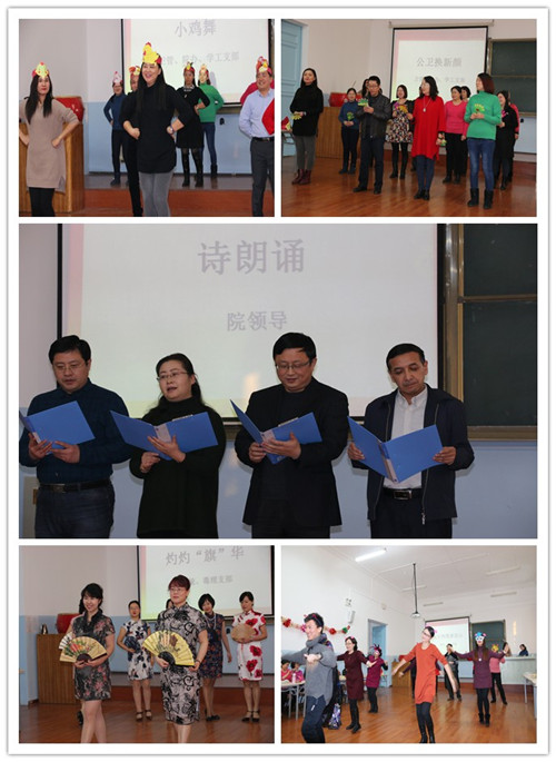 联谊会在节目三句半《公卫换新颜》中拉开帷幕,将过去一年学院从教学科研到文化建设一一细数,所取得的成绩即离不开学院领导的高瞻远瞩,也离不开各位教职工的齐心协力,表达了在新的一年学院上下必将众志成城、再创新的辉煌的决心和愿望。《灼灼“旗”华》节目中,巾帼不让须眉的女教师们,为大家呈现出一场视觉盛宴。一身端庄典雅的旗袍装束,即落落大方又古典唯美,即展现学院女教师“中国风”之美,也流露其高贵典雅之气,赢得了全场热烈的掌声。随后,学院领导班子的一席诗朗诵——《民族团结像朵花》将此次活动主题升华,在由56个民族构成的祖国大家庭里,我们只有互相依存,互相促进,团结一心,共同发展,才能构建永久的和谐。由王茜老师带来的藏族舞蹈《浪拉山情》尽显雪域高原的纯净无暇。游戏《心有灵犀》和《精打细算》展示出教职工对大美新疆独特的西域风情美景和民族特色美食的眷恋之情。欢快活泼的集体舞《大王叫我来巡山》和《小鸡舞》更是迎合新年主题,为全院教职工送去了新年祝福。