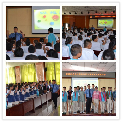 为进一步弘扬社会主义法治精神,增强未成年人法治意识,2017年9月14日,自治区人民检察院和自治区教育厅“法治进校园”巡讲团一行七人来到新医大附属中学,在中学楼五楼多功能厅举行了一场未成年人法治教育主题巡讲活动,此次巡讲由乌鲁木齐市中级人民检察院杨帆检察官主讲,主题是:知法,守法,远离犯罪。中学部300余名师生聆听讲座,学校党总支书记兰春琳出席,副校长朱承华主持了仪式。