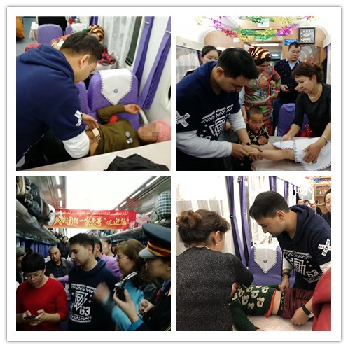 此时,列车广播突然传来焦急的声音:4号车厢有一名孩子突发疾病,需儿科医生查看。新医大一附院结亲队伍中的神经内科韩登峰和心脏起搏电生理科麦麦提阿卜杜拉•麦麦提敏两名大夫听到广播后,立即赶往患者所在的车厢。现场,一位母亲泪流满面、手足无策地抱着孩子,我院医生立即联系列车长,将患儿转移到通风良好的餐车进行抢救。医生经了解得知,这个3岁半的小女孩在几小时前因乘坐公交车时遇到急刹车,面部着地跌倒鼻腔流血,孩子母亲用餐巾纸堵住鼻腔止血。半个小时,孩子突然说头疼,哭闹不止,并伴有发热症状,新医大一附院的两位医生和一同赶来的自治区人民医院的医生胃孩子进行了全身检查,排除了其他可能潜在的问题。医生给孩子摆好体位,简单清理了鼻腔口腔内的血迹,避免因再次出血或呕吐导致误吸,并建议患儿就近下车做进一步诊断治疗。