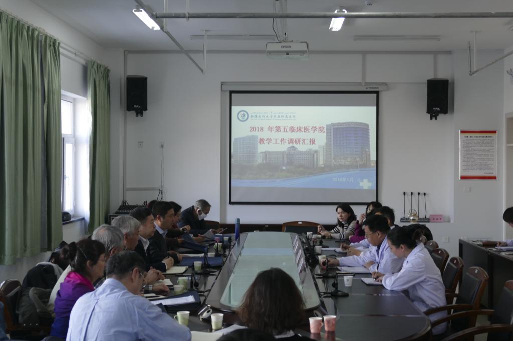 工作组首先来到第五临床医学院,听取了刘志云院长的汇报,教务处唐金华处长对分流教学中提出的问题进行了解释。姚文兵副校长在讲话中,对第五临床医学院所做的工作给予了充分肯定,鼓励临床医学院继续努力,同时对做好审核评估工作做出重要指示:一是各临床医学院既要做到教学工作同质化,又要体现各自特色;二是要建设一流大学就要有一流本科专业就要抓好教学和师资力量建设;三是要高度重视教学工作,要定期在党政联席会议开展教学工作研究。