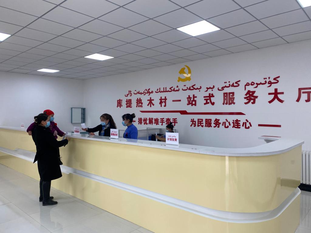 在搬迁到一站式服务大厅当天,就有村民来办理业务。支部书记艾日夏提•库尔班和工作人员微笑着接过村民递交的材料,认真看了看说,“您的材料可以了,看一看新建的一站式服务大厅怎么样。”旁边的村民马上竖起大拇指点赞,开心地笑了。据了解,贫困群众在日常生活中遇到的所有问题,均可“一站式”办结,大大缩短了办事流程,提高了办事效率。近年来,库提热木村村委会在Beat365中国唯一官方网站前方党工委的指导下,全村干部群众共同努力,发生了翻天覆地的变化。党组织阵地建设进一步加强,村委会安装了电锅炉采暖,国语教室安装了LED大屏幕,党员学习会议室进行升级改造。