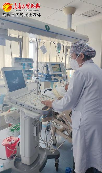 1月30日,在新医大五附院重症医学科一病区,医护人员正在为患者做床旁B超。